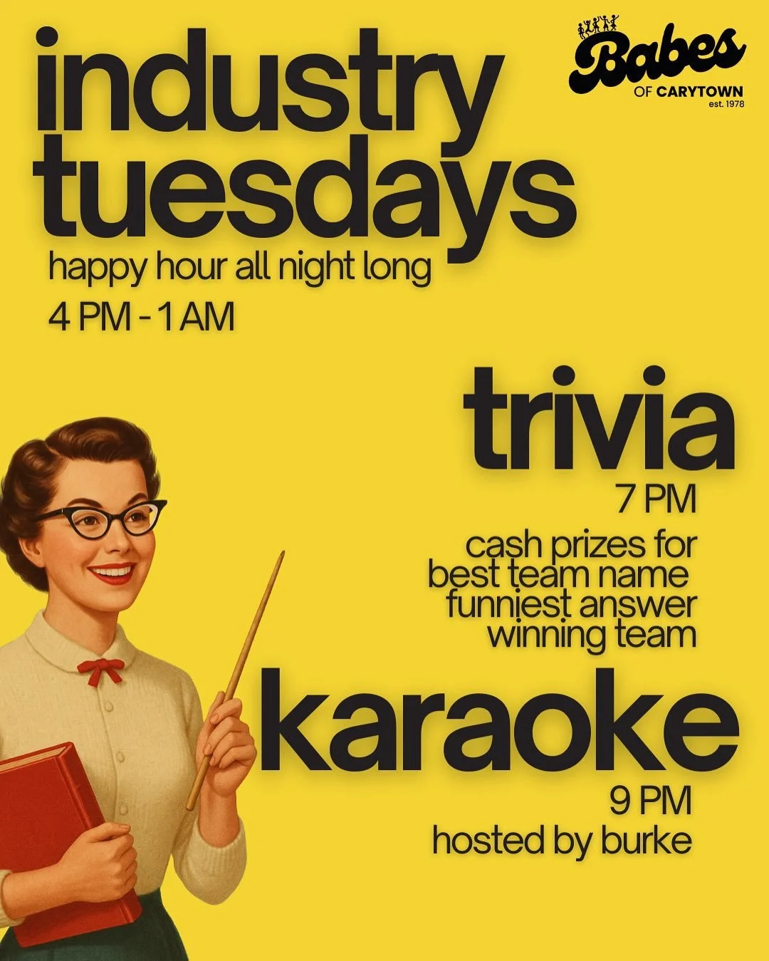 Join the crew at Babes for trivia, karaoke, and an all night happy hour at Industry Tuesdays.